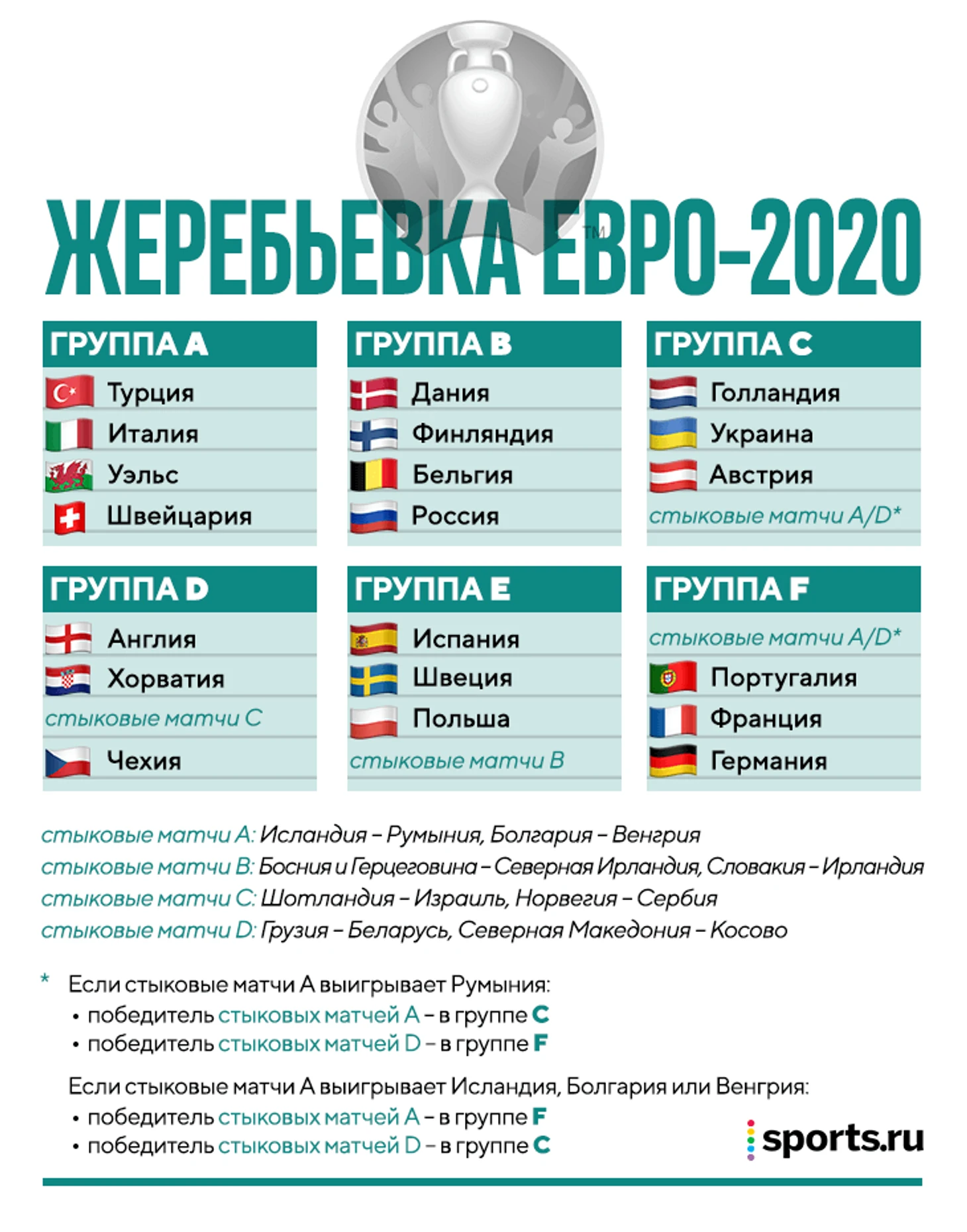 • Впервые в истории на жеребьевке не определился весь состав групп. Дело в сложном отборе, в котором задействован новый турнир – Лига наций. Осталось провести что-то вроде стыков, матчи пройдут 26 и 31 марта – командам нужно будет пройти двух соперников. Финально составы групп станут известны 1 апреля.