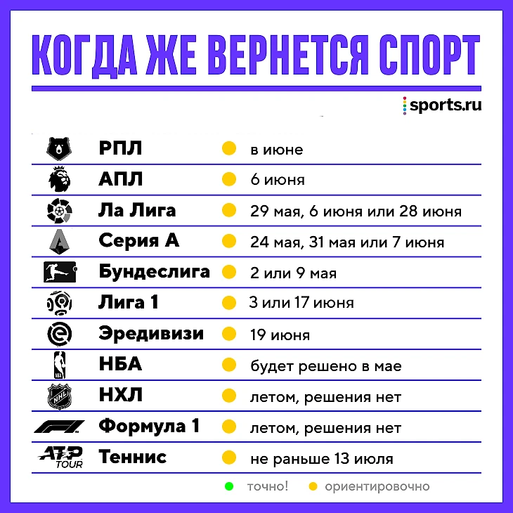 А у правительств есть свои прогнозы по развитию эпидемии и планы по снятию ограничений. Если всё пойдёт так, как идёт сейчас, то уже в июне (в май всё же пока не верю) какой-то спорт да, без зрителей, да, при строгом контроле всех присутствующих, но можно будет проводить. В конце лета возможен ограниченный допуск болельщиков на трибуны, полноценный, вероятно, не раньше осени