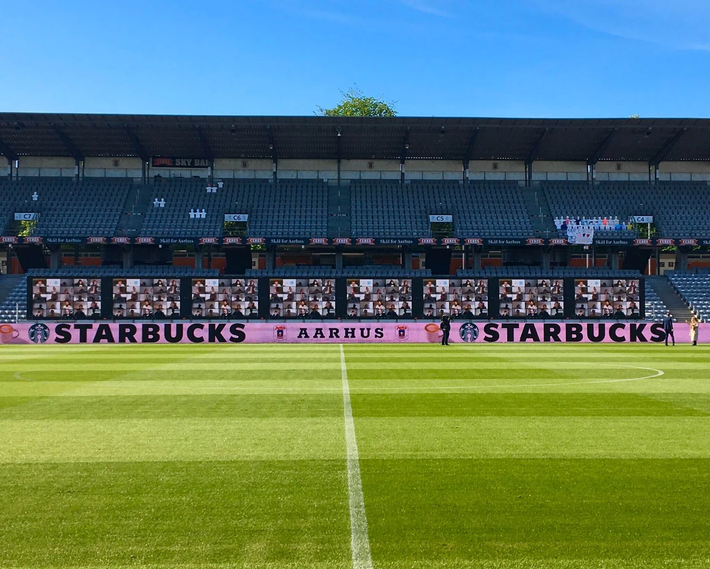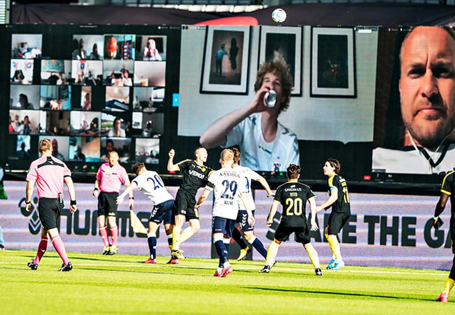 Всем кажется, что матч без зрителей – это пустота, тишина и грусть. Но датский «Орхус» превратил негативный изоляционный фон в повод развлечься – и установил на стадионе огромный экран вдоль центральной трибуны. 40 метров в длину и 3 в высоту – этого хватило, чтобы частично прикрыть пустые кресла. Во время матча на экран крупным планом выводили видео болельщиков, которые получили бесплатные онлайн-билеты и подключились к клубу по видеосвязи в приложении Zoom.