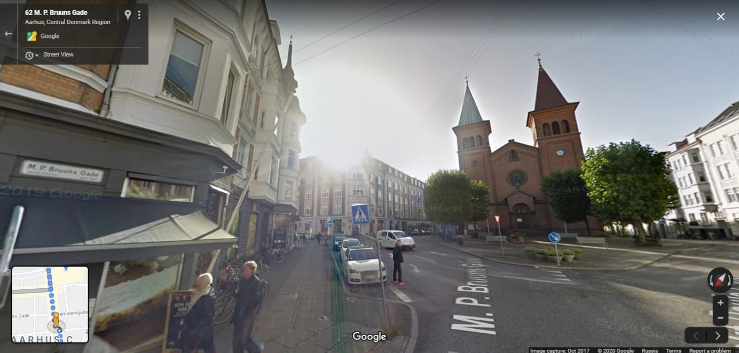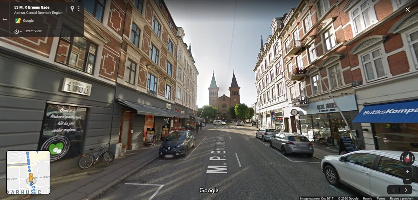 Пройти этим путем можно и сейчас: если можно присутствовать на стадионе через Zoom, то почему не погулять по Орхусу перед матчем в Google Maps? Прогулка до Марселисборгских лесов, где находится стадион, в реальности заняла бы 30 минут, а в панорамах Google Maps хватит 5-7.