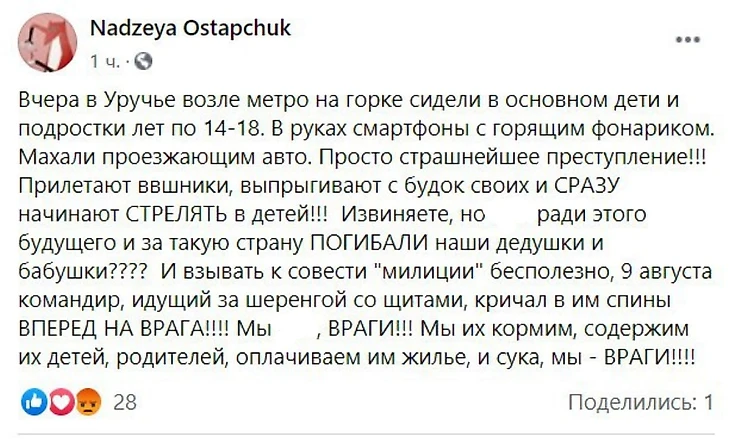«Некоторые из ваших коллег уже взяли кровь на руки. Граждане нашей страны просят только одного: честных выборов и справедливого подсчета голосов. Призываю всех сотрудников спецслужб, выходящих на усиления и дежурства не применять силу против мирных граждан своей страны».