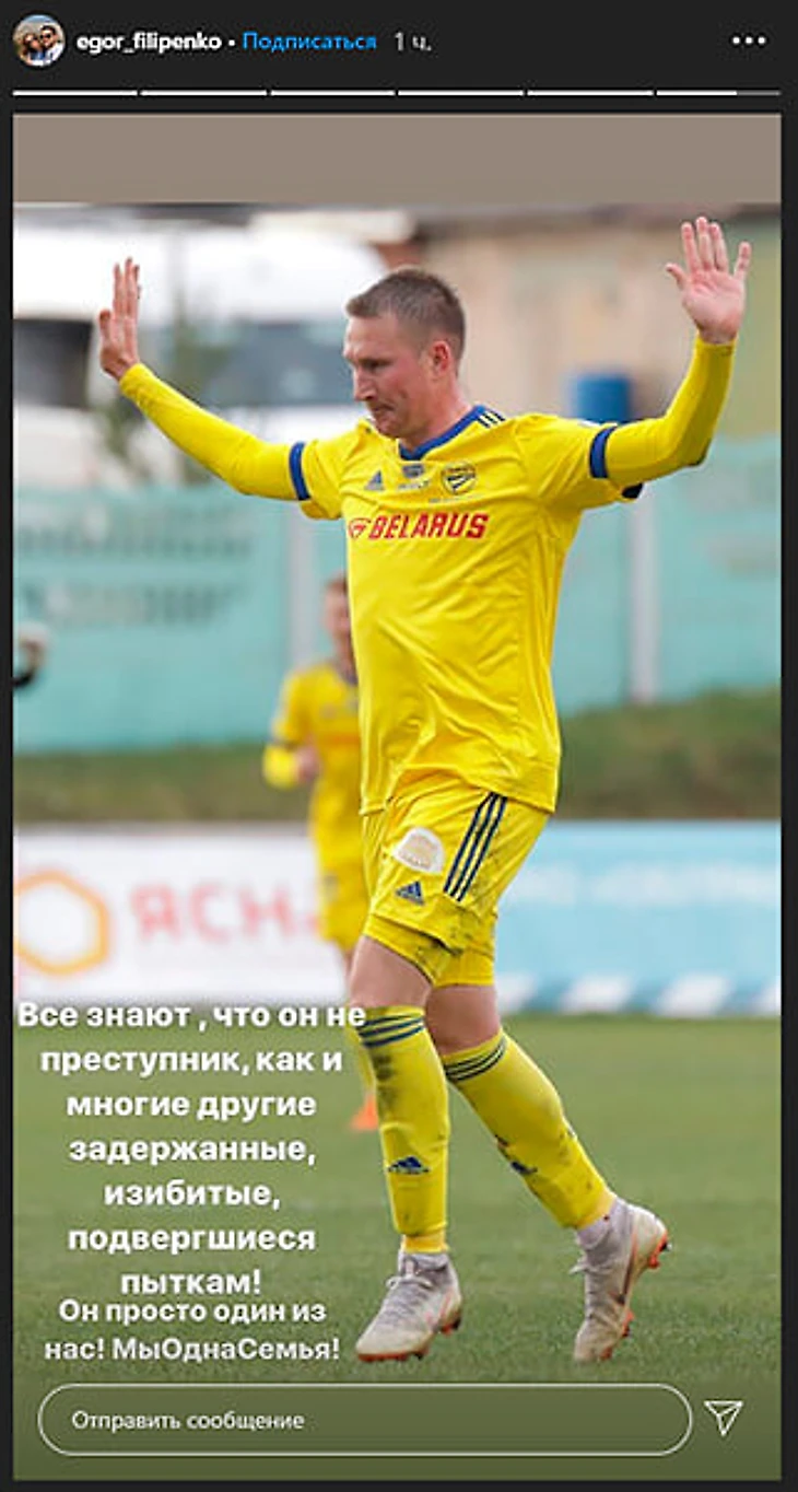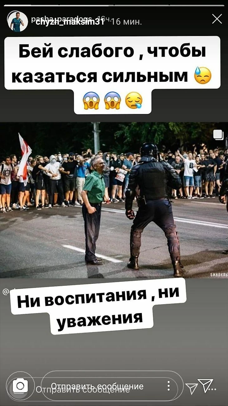 Полузащитник брестского «Руха» Максим Чиж опубликовал один из самых знаковых фотоснимков последних дней с подписью: «Бей слабого, чтобы казаться сильным. Ни воспитания, ни уважения».