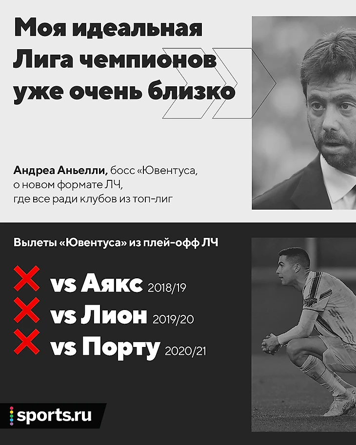 Из троих клубов, выбивших «Юве», только «Порту» – действующий чемпион. По логике Аньелли, ни «Аякса» (попал тогда как вторая команда Нидерландов), ни «Лиона» (был третьим в Лиге 1), если бы все уже работало по его плану, в ЛЧ бы не было.