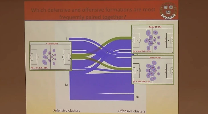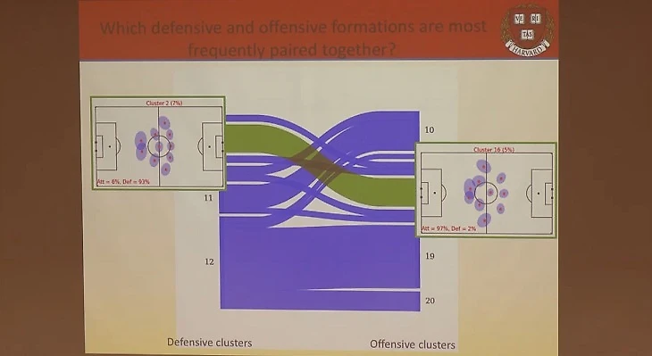 Вот одна из лекций Шоу в научном центре Гарварда (тема «Классификация и анализ стратегии команды в профессиональных футбольных матчах»), которая наверняка зацепила: алгоритм Лори проанализировал 4 тысячи тренировок и выделил 20 тактических схем, затем просмотрел 200 матчей и разделил схемы на защитные и атакующие, а потом выделил пары – из какой защитной схемы чаще всего команды переходят в конкретную атакующую.