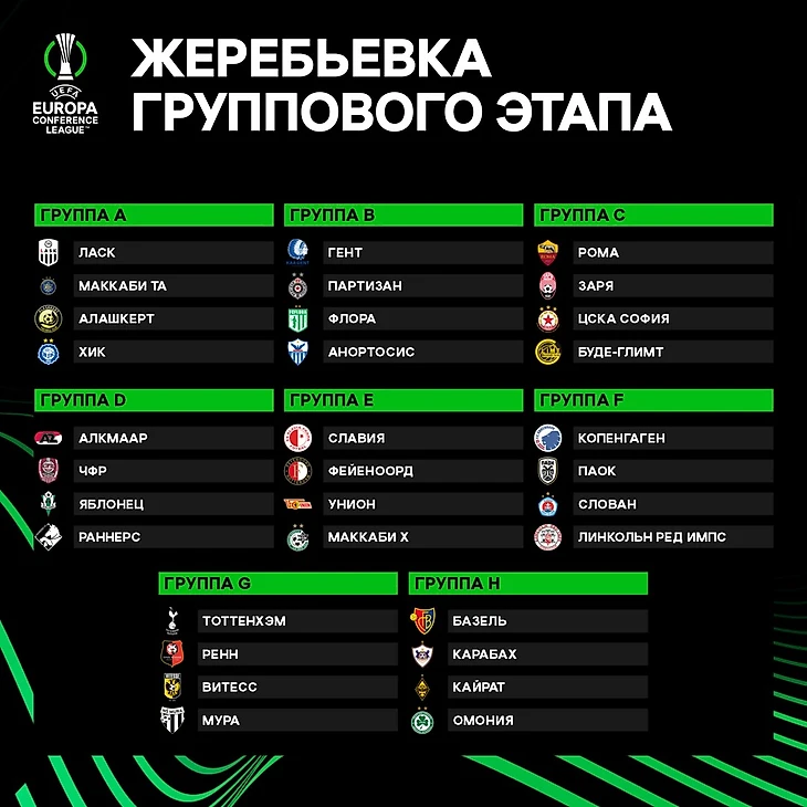 И здесь представители аж 27 стран (для сравнения: в Лиге Европы – 20, в Лиге чемпионов – всего 15). Более того, сразу три страны в Лиге конференций дебютируют на групповой стадии еврокубков – Армения, Эстония и (пам) Гибралтар.