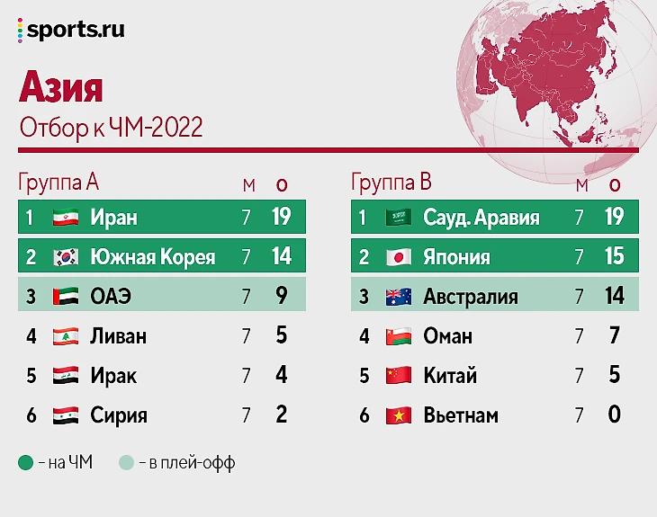 В группе A с прямым выходом практически все понятно: Южная Корея сильно оторвались от преследователей и, вероятно, скоро присоединится к Ирану. А вот за третье место теоретически может побороться даже Сирия, идущая последней. В группе B оторвалась Саудовская Аравия, а Япония и Австралия определят, кто из них поедет в Катар напрямую, а кто попробует проникнуть туда через стыки с южноамериканцами.