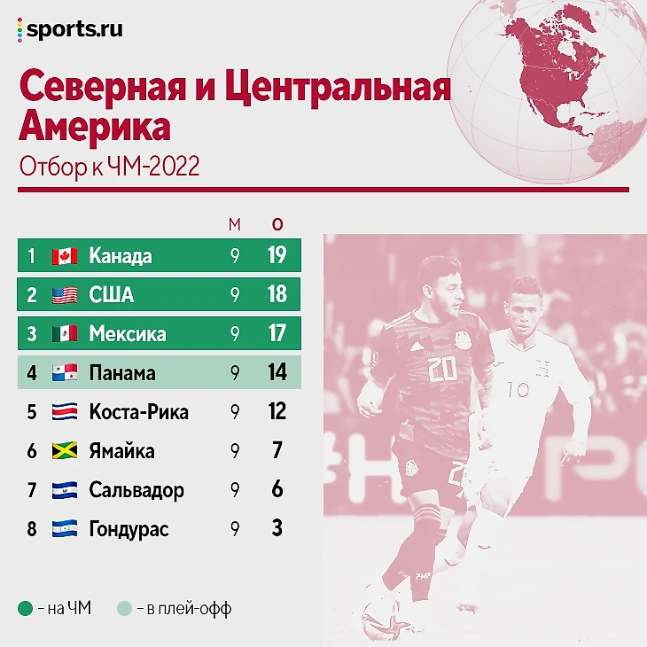 Три команды едут на ЧМ напрямую, еще одна – в стыки. Явные фавориты: США, Канада и Мексика, но последних поджимает Панама. Пока только эти четыре команды претендуют на прямые путевки, Коста-Рика тоже может влезть в борьбу, но при осечках лидеров.