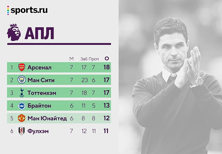 • Непривычный лидер – все-таки мы отвыкли видеть «Арсенал» на самом верху. Команда Микеля Артеты выиграла все матчи кроме одного – проиграли в гостях «МЮ» в начале сентября. Шесть других = шесть побед!
