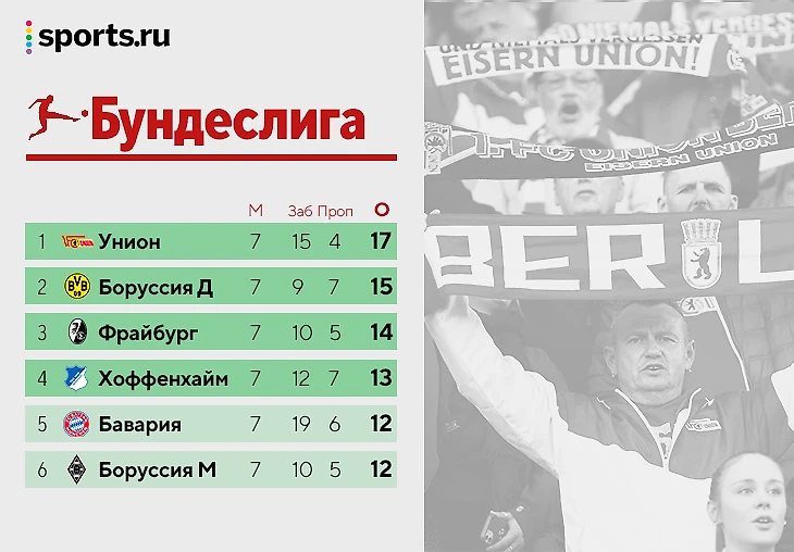 • «Унион» – лидер! Предыдущий раз берлинцы лидировали были первыми в 1970-м – еще в высшей лиге ГДР. Команда продолжает прогрессировать при тренере Уроше Фишере, в том числе они уже остановили саму «Баварию» – сыграли вничью в начале сентября.