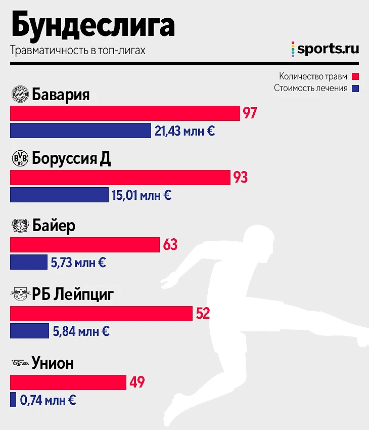 • «Бавария» и «Боруссия» традиционно в лидерах: футболисты чаще травмируются, а клубы за это много платят. Дальше по количеству травм идет «Герта» (91), которая чуть не вылетела из Бундеслиги.