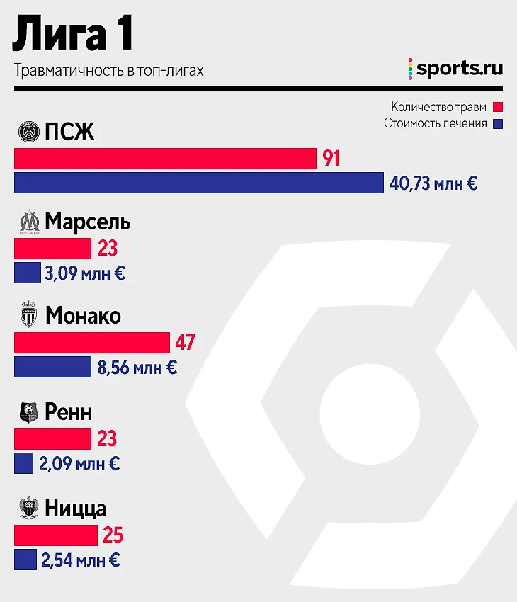 • В Лиге 1 «ПСЖ» и страдает (91 травма), и платит (40,7 млн евро) больше всех. Дальше с большим отставанием «Монако»: 47 повреждений, их вылечили за 8,6 млн.