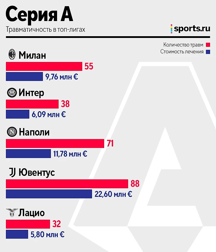 • Больше всех доставалось «Ювентусу»: 88 повреждений и 22,6 млн на лечение. На втором месте по количеству «Наполи»: 71 травма и 11,8 млн трат.
