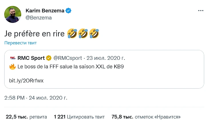 Потом началась ежегодная перестрелка колкими фразами. Сначала Ле Грэ говорил, что ждет изменения ситуации, потом сказал, что Бензема поступил «по-ослиному глупо», дальше повторял, что его карьера в сборной завершена. А в 2020-м вдруг восхитился сезоном Бензема, чем повеселил футболиста, сделавшего ретвит с хохочущими эмодзи и фразой «лучше посмеюсь».