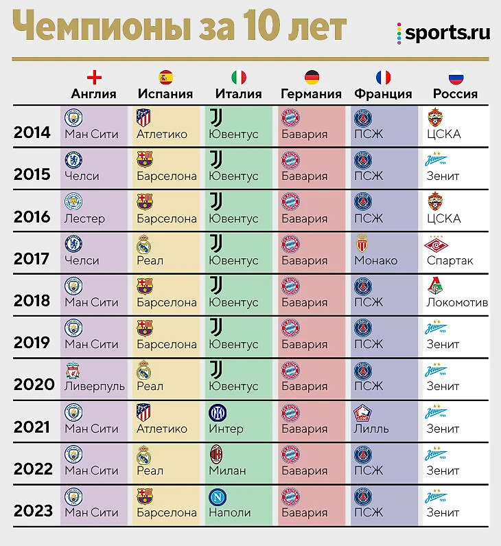 • Во всех чемпионатах выделяется доминирующая сила – клуб, который побеждал чаще остальных на этом отрезке. В Англии «Ман Сити» взял 6 титулов из 10, в Испании 5 из 10 у «Барселоны», в Италии 7 из 10 у «Ювентуса», во Франции 8 из 10 у «ПСЖ», в России – 6 из 10 у «Зенита». В Германии – 10 из 10 у «Баварии»!