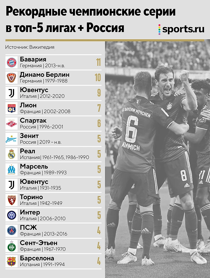 • «Бавария» – лидер по серии чемпионств среди топ-5 лиг. 10 лет подряд никто не выигрывал титул, кроме мюнхенцев – только берлинское «Динамо» в 80-х. Это был чемпионат ГДР, но мы все же решили включить его в список.