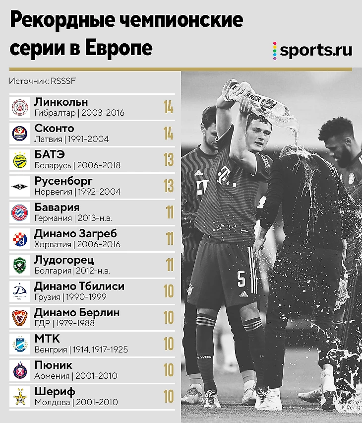 • Впрочем, «Бавария» все еще не европейский рекордсмен – самые длинные серии у гибралтарского «Линкольна» и латвийского «Сконто» (по 14 титулов). По 13 было у БАТЭ и «Русенборга».