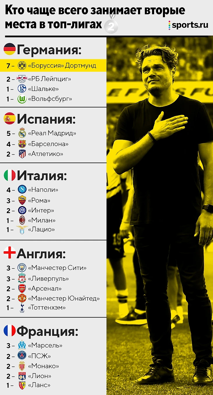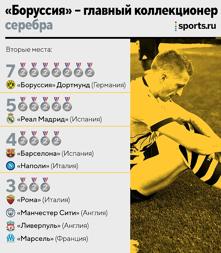 • После «Дортмунда» (7 вторых мест) идут испанские гранды – «Реал» (5) и «Барса» (4). Рядом еще действующий чемпион Италии «Наполи» (тоже 4).