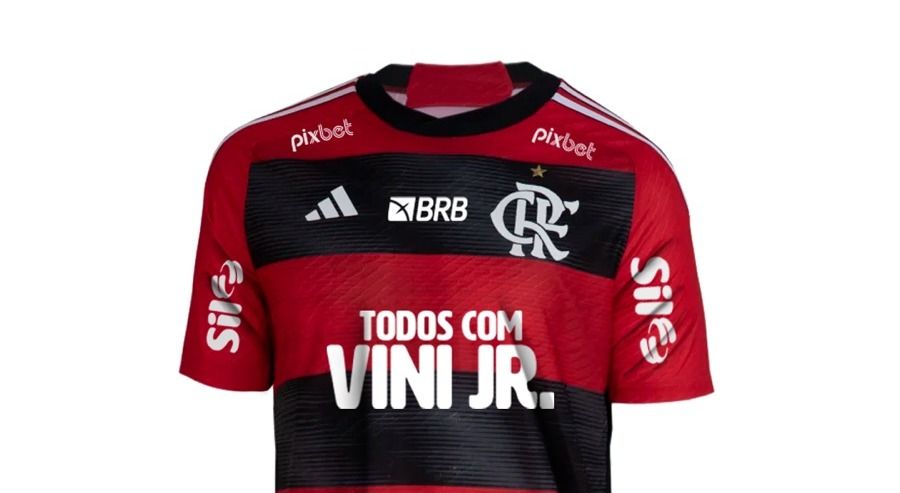 И на этом не остановились: «Фламенго» сыграл в форме, где вместо логотипа титульного спонсора по центру футболки располагается надпись: «Мы все с Винисиусом».
