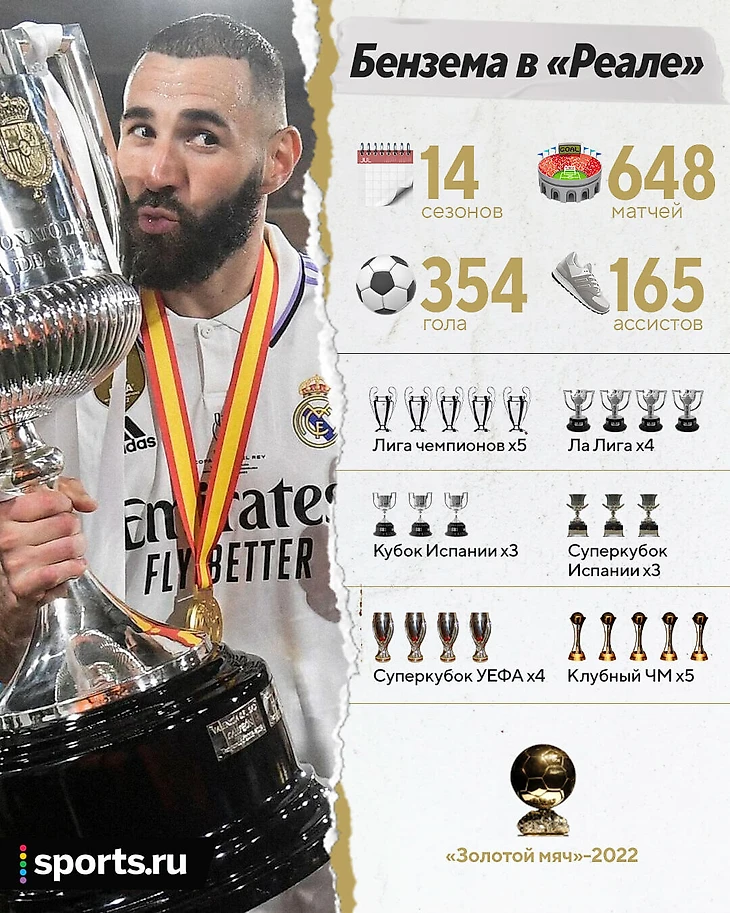 Бензема выиграл рекордное количество трофеев в истории «Реала» – 25 (делит лидерство с Марсело). По голам тоже застолбил позицию одного из лучших бомбардиров – 353 мяча, больше лишь у Криштиану Роналду (450). А по ассистам Карим и вовсе лучший – 165 голевых передач.