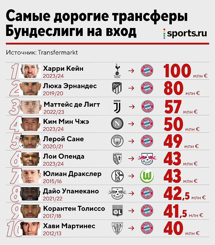 • Самая дорогая покупка вне «Баварии» – летний переход форварда Лои Опенды, которого «Лейпциг» забрал из «Ланса» за 43 млн евро, и это еще без учета бонусов.
