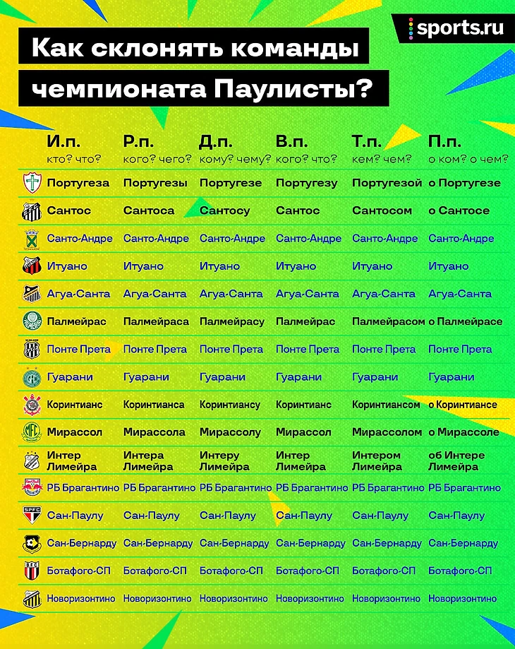 Чемпионат Паулисты для нас новая территория, не только футбольная, но и лингвистическая. Здесь много команд, с которыми мы встречались редко или вообще не встречались. Как правильно произносить, склонять и сочетать их названия?