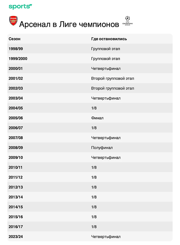 В остальных 18 сезонах «Арсенал» четырежды вылетал на групповых этапах, пять раз – в четвертьфинале, еще девять раз – в 1/8 финала.