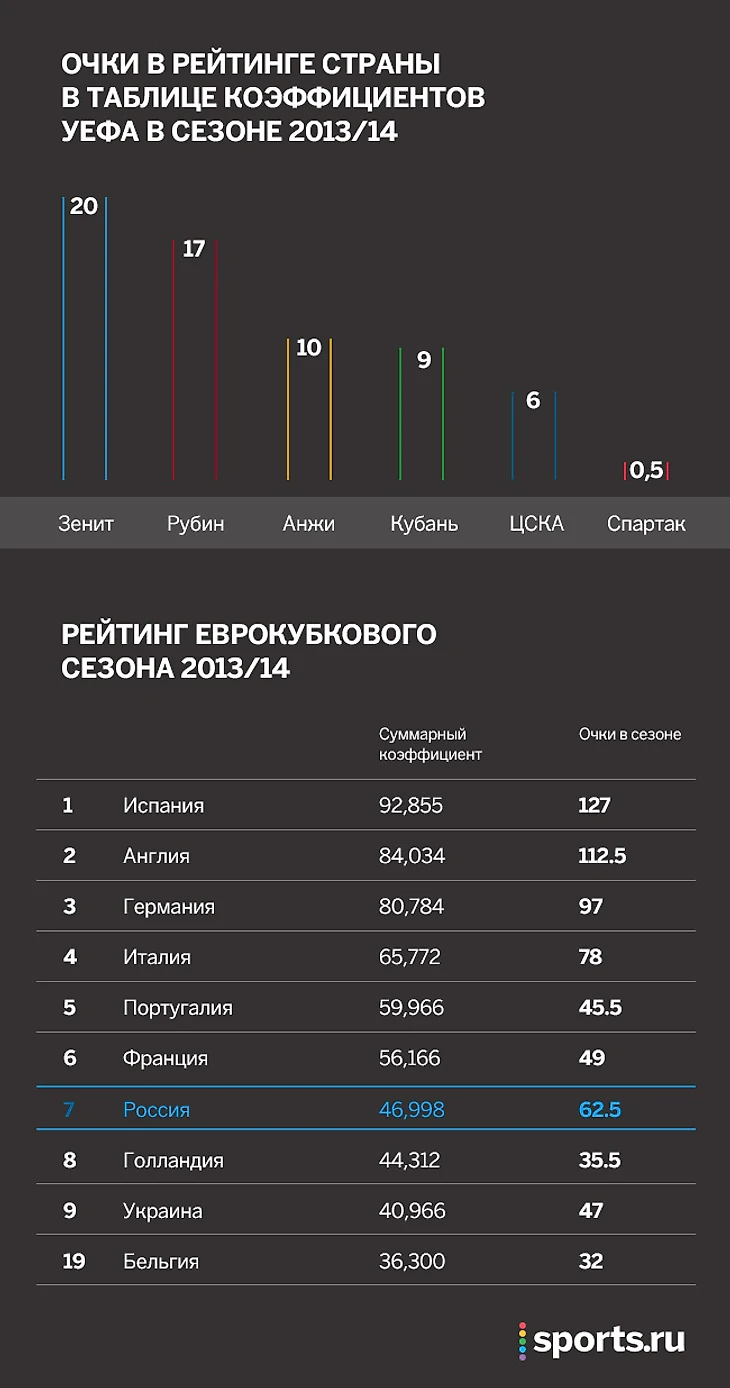 Россия, делегировавшая в сезоне-2013/14 шесть команд в Лигу чемпионов и Лигу Европы, завершила этот евросезон на 7-м месте в таблице коэффициентов УЕФА. Всего команды из России набрали 62,5 очка в этом сезоне, что в пересчете на 6 клубов принесло 10,416 балла в зачет страны.