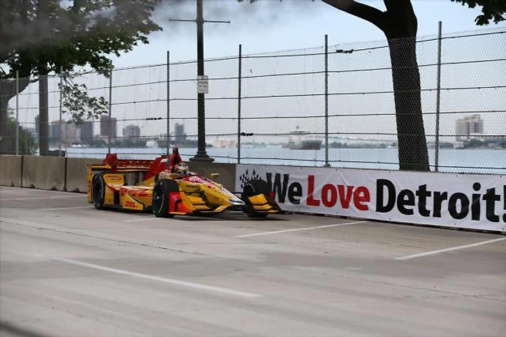 В квалификации Гран-При Детройта каждая из двух подгрупп, на который пелотон был разделен по итогам практик, имела по 12 минут на трассе и пять гарантированных минут под зелёным флагом. Последняя приписка была актуальной для первой подгруппы. Элио Кастроневес, выехавший на "красных" шинах, установил первый ориентир для гонщиков (1.16:7921)и сразу же сессия была прервана красным флагом - не прошло и четырех минут, как на выезде из второго поворота зацепил стану Карлос Муньос, кстати,также ехавший на "красных" шинах, чью машину убирали с трассы и чинили отбойник почти все осавшееся до конца сессии время, а гонщики получили дополнительные 1 минуту и 9 секунд. За время простоя все поменяли шины на "красные" и улучшили свое время, а лучшим в первой подгруппе стал Райан Хантер-Рей с резулльтатом 1.15:2883.