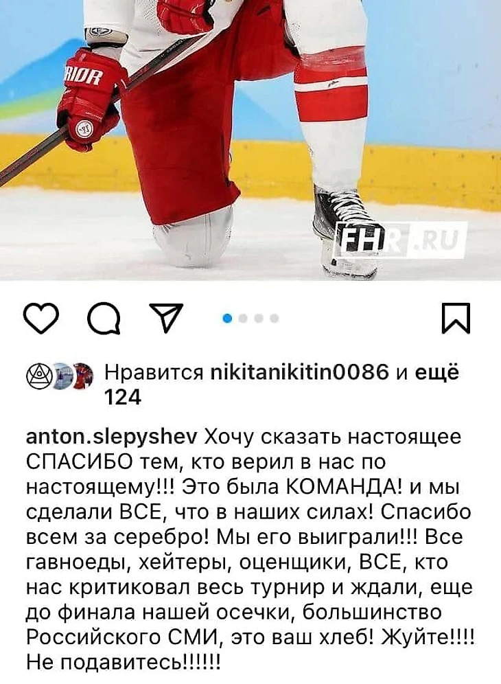 При этом финал в актив Слепышев вряд ли запишет – обе шайбы финнов влетели в наши ворота, когда на льду находилось звено Антона. Поражение далось ему непросто – он отказался общаться с прессой после матча, а затем выложил такой пост в свой инстаграм.