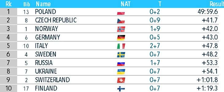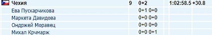 Мужская эстафета прошла без перфоманса андердогов, отмечу лишь высокое 5-ое место сборной Словении, и отличное выступление Рока Тршана, который благодаря чистой стрельбе на двух рубежах затащил словенцев в цветы.