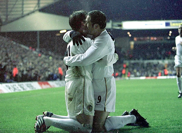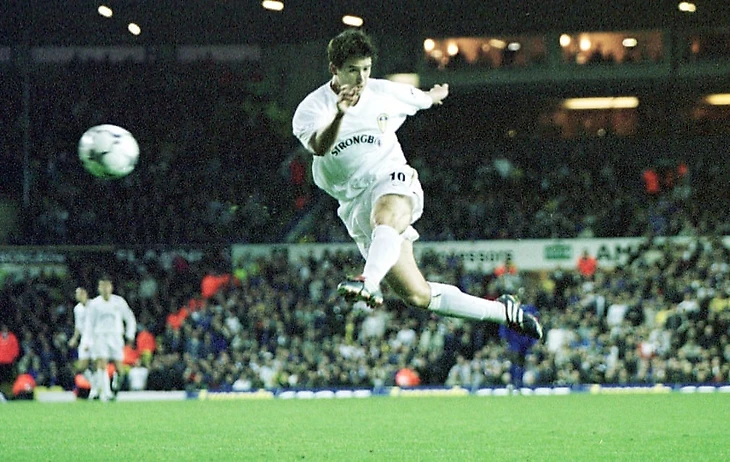 Кьюэлл парит над полем Эллэнд-Роуд в октябре 2001, матч против Челси. Всего за Лидс он проведет 181 матч и забил 45 мячей.