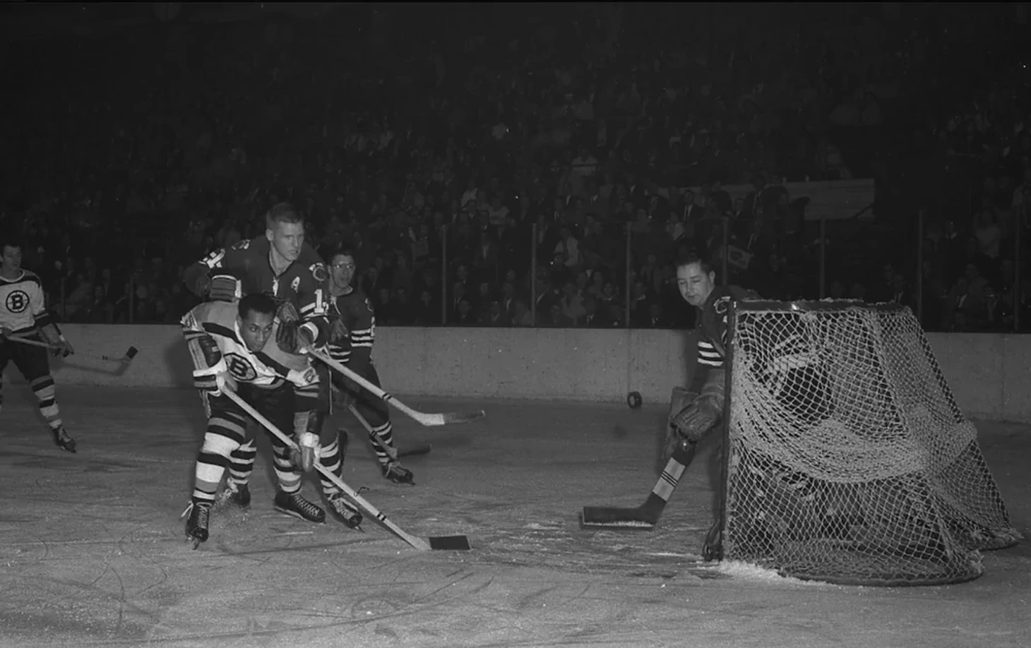 Из всех персонажей на этой фотографии я Вас знакомил только с Гленном Холлом. Хотя многие, наверняка, знают и остальных. Теперь я чуть-чуть расскажу о них с "привязкой" к Эрику Нестеренко. Собственно, "привязать" двух "полевых" "Блэк Хокс", а это Билл Хэй и Эл Арбур, несложно - как-никак фото из чемпионского сезона 1960-61, и Эрик, если не на площадке, то на скамейке точно присутствует. А вот игрок "Бостон Брюнз" на переднем плане - это легендарный Вилли О Ри - первый темнокожий хоккеист в НХЛ. Сейчас много говорят о "тотальном угнетении белыми чёрных". И вот О Ри вынес несколько лет назад на суд людской историю "из тех чёрно-белых (я про фото) времён". Он поведал, что в матчах против "Чикаго" Эрик Нестеренко преследовал его именно на расистской почве. Они несколько раз дрались, однажды "Мистер локти" выбил клюшкой ему пару зубов и регулярно отпускал в адрес Вилли расистские оскорбления. Эрик парировал, заявив примерно следующее, что он, мол, "со многими дрался (даже с САМИМ Горди Хоу доводилось), зубы хоккеиста - материал расходный, не велика потеря (спросите у Бобби, если мне не верите, или у Сани Овечкина), а на счёт расизма - это ты, Вилли, "не гони". Я надеюсь, у Вилли О Ри хватит такта не раздувать скандал о расовой дискриминации, а то эта тема и так приобретает гротескно-уродливые формы. А ведь знаете, у Эрика Нестеренко есть тоже звание "первый в Лиге". И знаете в чём. Не поверите, особенно глядя на фотографии с синяками и зная про "энфорсерский" стиль "Мистера локти". Нестеренко стал первым действующим хоккеистом НХЛ, который получил высшее образование! В 1951-ом, почти одновременно, он получил приглашение на бесплатное обучение в Мичиганском университете и профессиональный контракт из "Торонто Мэйпл Ливз" от самого "Кленового диктатора" - мистера Конна Смайта. Решение Эрика было мгновенным и предсказуемым. Решение отца было иным (играя Дэйна Янгблада, Нестор не понаслышке знал, какова бывает отрицательная реакция родителя на увлечение сына хоккеем). В конце концов со Смайтом удалось договориться и Локти совмещал игру с учёбой. Коли зашла речь об отце Эрика, скажу, что он выходец из Российской империи, вырос в деревне на Черниговщине (тоже, в некотором роде, фермер). После событий, связанных с революциями и Гражданской войной, эмигрировал в Канаду. Есть информация, правда не проверенная, что Нестеренко-старший - участник петлюровского движения. Эрик родился уже в Канаде в 1933-ем. Поэтому я заявляю - Эрик Нестеренко - канадец, да, с украинскими корнями. А фотографию с Вилли О Ри мы ещё рассмотрим повнимательнее, на ней есть очень интересные персонажи. Но не сегодня.