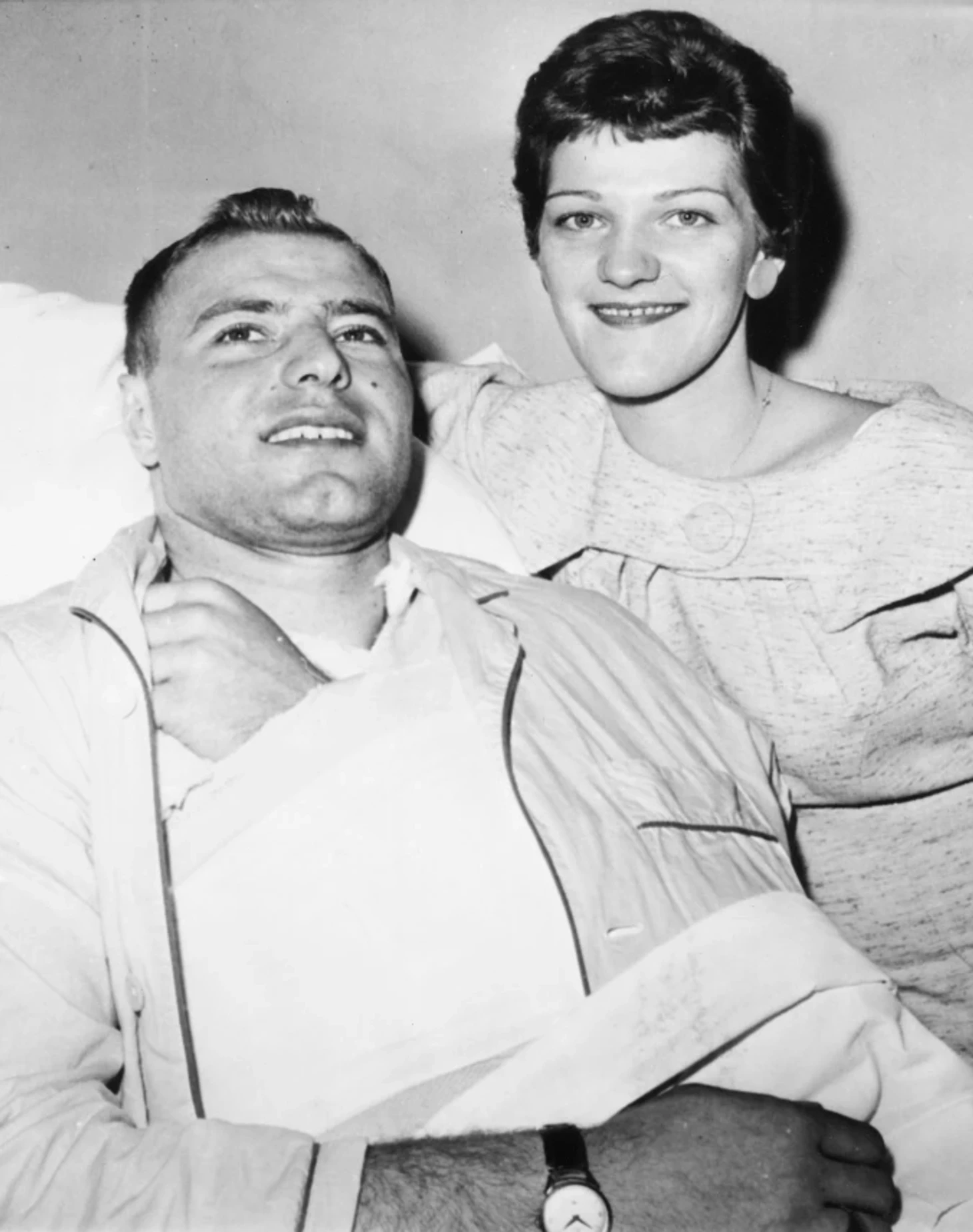 "Мне сначала казалось, что зрители в "Чикаго Стадиум" недовольны толи мной, толи моими действиями. Как только я выходил на лёд или касался шайбы, они как-будто начинали неодобрительно гудеть: "Уууууу..." - именно так вспоминал свой первый матч на домашней арене "Блэк Хокс" Элмер Васько. "Только к концу первого периода я понял, что они затягивают слово: "Мууууууууус..." Знаете, что такое "мoose" по-английски? Лось. А теперь ещё раз смотрим на представленное фото. Да, Тед Линдсей был далеко не гигантом, но по сравнению с Васько он выглядит просто каким-то карликом. "Лось" - именно с таким прозвищем вошёл в НХЛовские анналы Элмер Васько. Строя "Блэк Хокс" "по кирпичику", Томми Айвен, конечно же, понимал, что Гленн Холл - это полкоманды - без сомнений; Халл с Микитой порвут кого угодно; изогнутые клюшки - тоже на стороне "индейцев", но... Без надёжной защиты выжить в НХЛ, что тогда, что сейчас - нереально. Роль "первой скрипки" в защитных схемах "Ястребов" отводилась почти безоговорочно Пьеру Пайлоту. Но что значит - "первая скрипка"? Условность. И защитники играют парой. В пару Пайлота и Васько свёл ещё Дики Ирвин в сезоне 1956-57 - первый сезон Элмера в Лиге. Это оказалась очень эффективная и очень надёжная связка на много лет. Те, кто "поёт оды" оборонительным редутам, скажут Вам, что эффективность этой пары в зоне защиты была не менее высокой, чем эффективность пары Халл - Микита в зоне атаки. В первые сезоны Лось не мог действовать с максимальным КПД по причине застарелой травмы плеча. Руководство "Блэк Хокс" и мистер Айвен лично приложили немало усилий, чтобы найти клинику для операции Васько. Вот фотофакт.