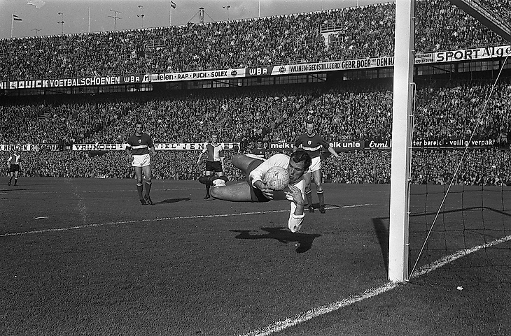 22 октября 1967 года, «Де Кюйп». Матч между «Фейеноордом» и GVAV (будущий «Гронинген») завершился нулевой ничьей. На фото: 24-летний Томми ван Леувен справляется с дальним ударом, слева от вратаря – нападающий хохяев Рууд Геелс, справа – защитник гостей Мартин Куман.