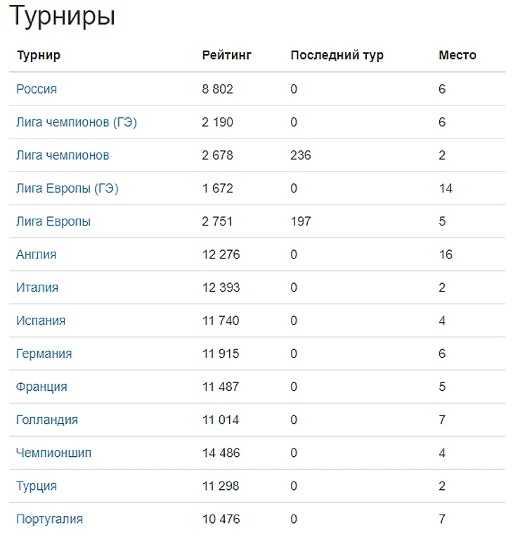 Итоговая таблица с количеством попаданий в топ-100 в разрезе чемпионатов и финальным местом в рейтинге мощности http://fantasyteams.ru/ (можно увеличить по клику).