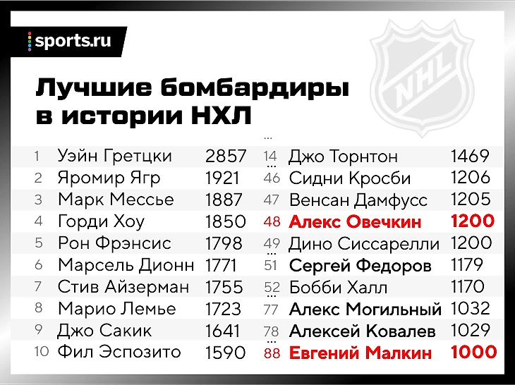 Александр – 49-й игрок в истории НХЛ, кто добрался до отметки в 1200 очков, и третий из действующих игроков: у Джо Торнтона 1469 очков, у Сидни Кросби – 1206.