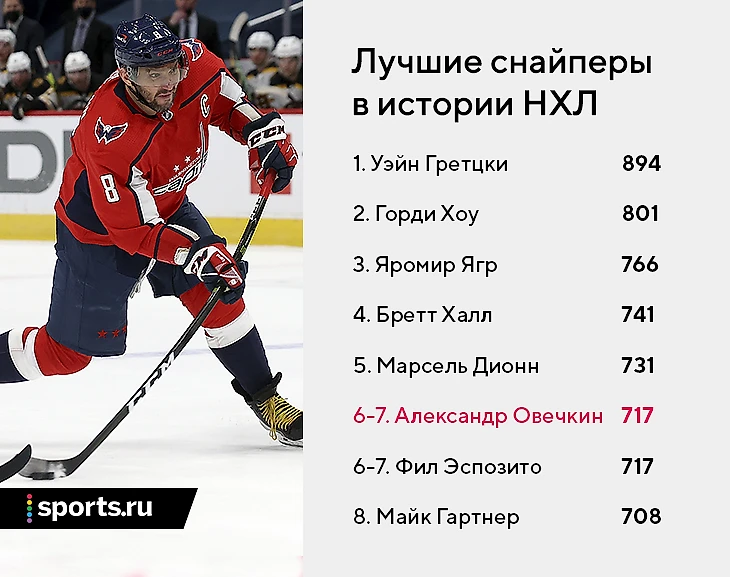 Но в последних пяти матчах поправился прицел – уже все выглядит не так печально: 4 гола, полезность «+4», Овечкин вышел на чистые вторые места в истории по голам в гостевых матчах и броскам в створ. А в сегодняшней игре – с «Баффало» – наконец-то добрался до шестого снайперского места в НХЛ: 717 шайб за карьеру в регулярках – столько же, сколько и у Фила Эспозито.