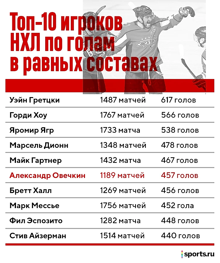 Практически любая шайба Овечкина означает, что в какой-то из миллионов статистических таблиц происходят новые движения. Этот автогол Далина – не исключение. Александр остался на 6-м месте по голам в равных составах, а вот Бретт Халл спустился на одну позицию.