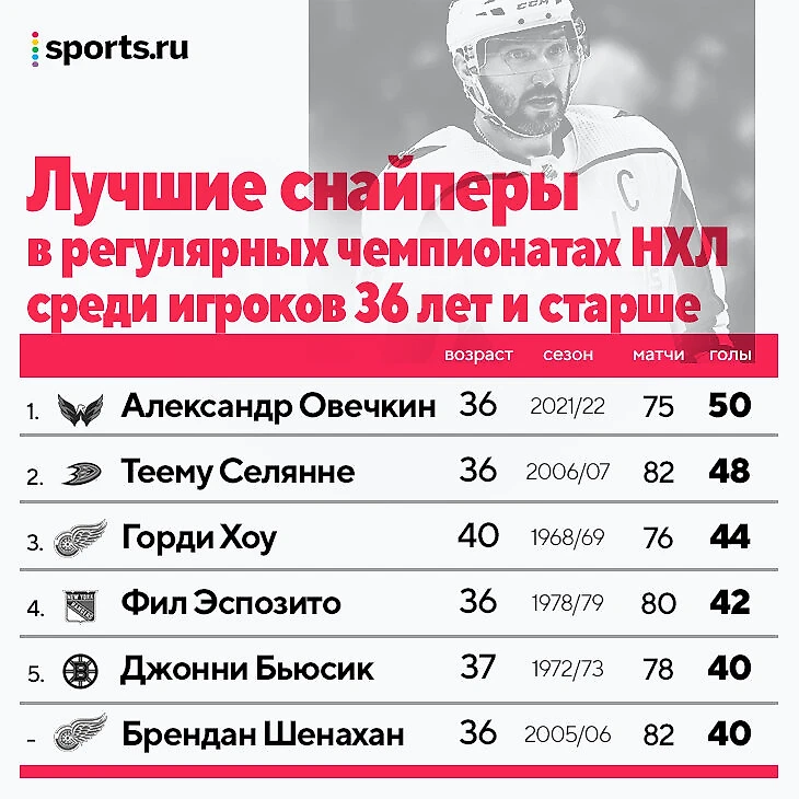 До Горди Хоу и второго места в исторической гонке снайперов – всего 21 шайба. Овечкин должен отпраздновать это событие уже в следующем сезоне. Ну и теоретически у него есть еще минимум 4 попытки оторваться от Гретцки и Босси по количеству сезонов с 50 голами – если это произойдет, никто уже не удивится.