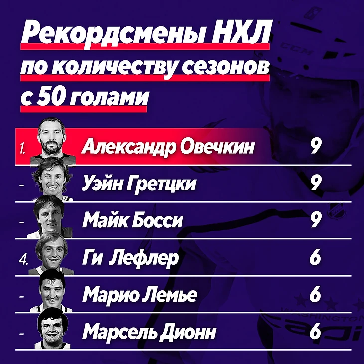 Овечкин в девятый раз за свою карьеру забросил 50 шайб в регулярке! Фантастика какая-то! Ни у кого в истории не было результата лучше. Такой же – только у Гретцки и Босси.