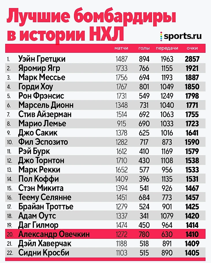 И ещё Ови вошёл в двадцатку бомбардиров НХЛ, 1410 очков, обошёл Хаверчука, за 4 года точно до десятки дойдёт, 1600+,, ~1700 очков будет у Ови!