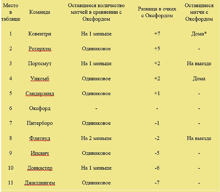 После 4 побед подряд, все выглядит гораздо приятнее, чем это было в середине месяца. Хотя за 10 матчей до конца чемпионата Оксфорд уже не претендует на прямой промоушен в Чемпионшип. Ковентри имеет отрыв в 7 очков и при этом еще имеет матч в запасе. Но от того же Ротерхэма отрыв уже 5 очков, а количество матчей сыграно одинаковое. В то же время пока еще совсем не гарантирована даже место в зоне плей-офф. Уже сегодня Флитвуд играет свой перенесенный матч против Ипсвича и может опередить «желтых» в случае победы.