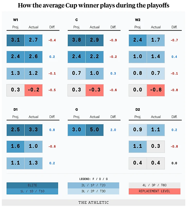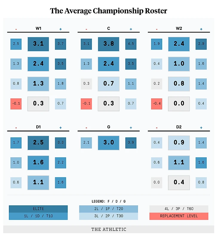 Для этого я заручился помощью аналитика The Athletic Дома Лущишина. В сентябре Лущишин написал роскошную статью о том, как выглядит средний состав обладателя кубка Стэнли. Используя собственную модель GSVA (Game Score Value Added, приблизительное число, отражающее количество побед, добытых усилиями конкретного игрока), он вывел средний уровень игры каждого победителя розыгрыша кубка на каждой позиции состава, чтобы показать, какой тип команды выигрывает. Это изучение не затронуло действующего чемпиона, «Лайтнинг», поскольку было проведено прежде, чем окончилась финальная серия. Таким образом, цифры включают всех обладателей кубка Стэнли с 2010 («Чикаго») по 2019 («Сент-Луис»).
