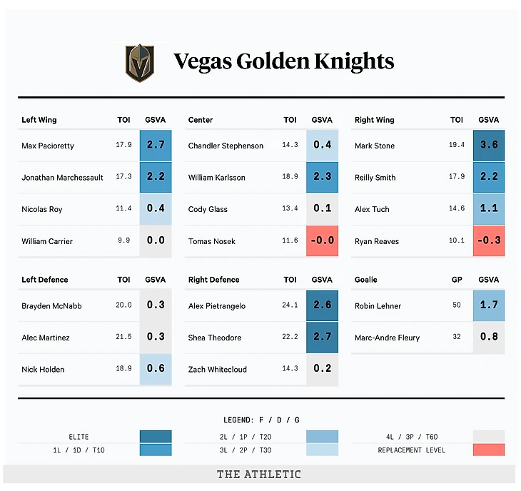 На флангах «Вегас» хорош, возможно, даже лучше прежних чемпионов. Если Пачиоретти удержит свой показатель на уровне 2.7 GSVA, он перекроет средний результат второго вингера в первом звене. Джонатан Маршессо – практически в точности то, что нужно команде во втором звене, а Райлли Смит так и подавно гораздо лучше большинства. Далее «Вегасу» добавляют глубины крайние нападающие Алекс Так и Ник Руа (который играет как в центре, так и на фланге), которые обещают быть сильной опцией в третьем звене.