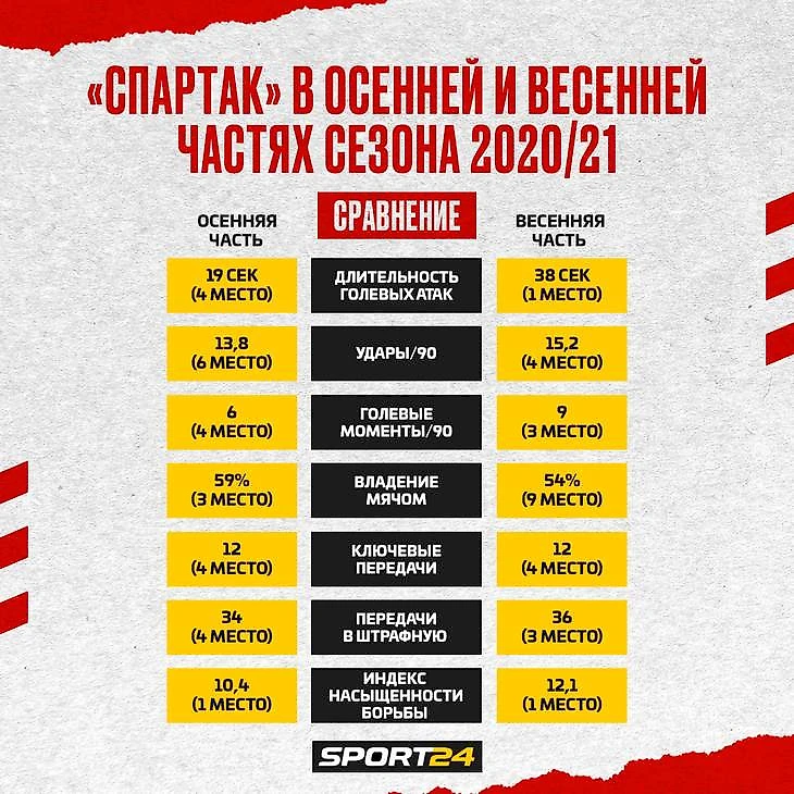 На отличные физические кондиции «Спартака» намекает и индекс насыщенности борьбы (количество отборов и перехватов на минуту владения соперника). Красно-белые и в первой части сезона были лидерами по этому показателю, а сейчас улучшили свои показатели.