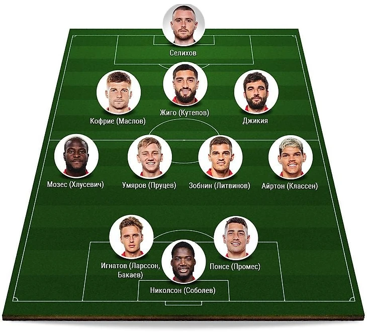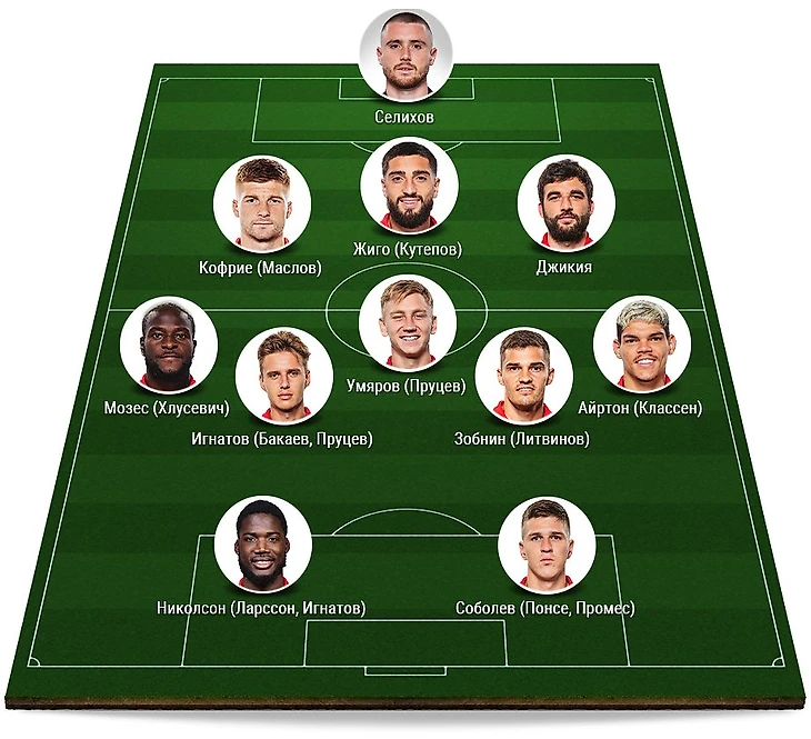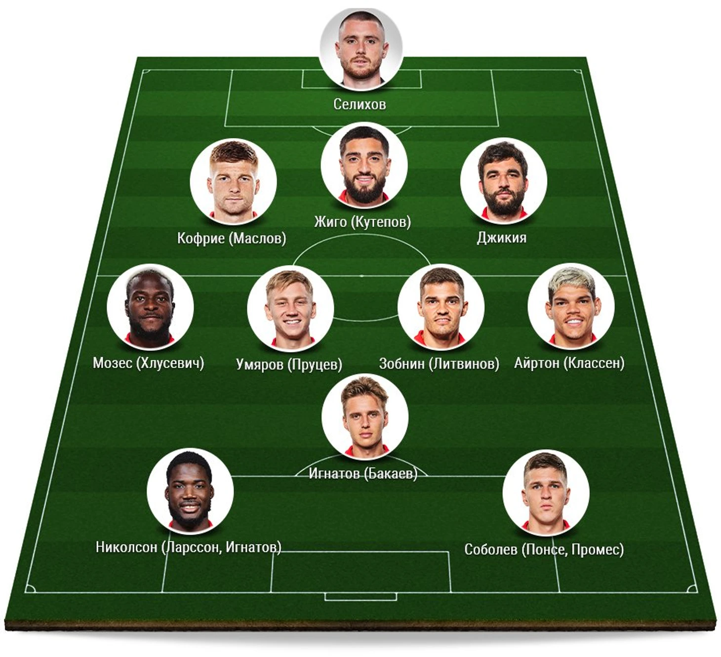 В этой схеме один нижний опорник (Умяров либо Литвинов), а также две подвижные «восьмёрки» над ним – Зобнин и Игнатов/Пруцев. Самое важное – соблюсти баланс и не выставить одновременно трёх футболистов со слабой поддержкой атаки в финальной трети. Например, Литвинов + Умяров + Зобнин – трио, при котором команда просядет в остроте и в добеганиях в штрафную. При определённых сценариях в центральную ось может добавиться и Бакаев, хотя это не самая комфортная для него позиция.