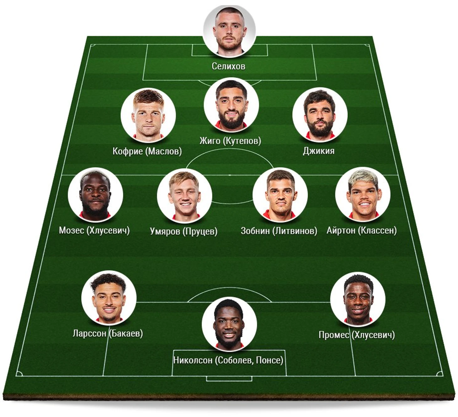 Два нападающих выбираются исходя из тактического плана и особенностей соперника. Это могут быть как два фактурных форварда (Николсон и Соболев, Николсон и Понсе), так и комбинация из «большого» и «быстрого» (Николсон и Ларссон, Соболев и Промес). Мозес и Хлусевич конкурируют за место на правом фланге, Кофрие и Маслов (второй — если наберёт форму после тяжелой травмы) – за позицию правого центрального защитника. В атаках будет преобладать фланговый акцент.