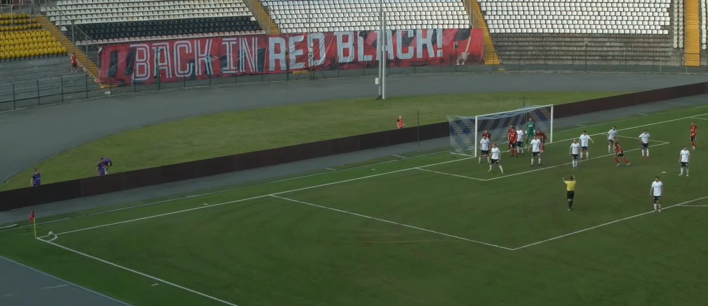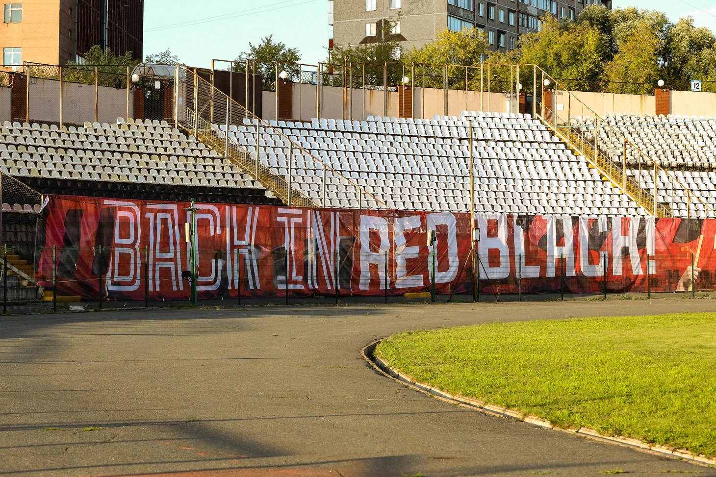 В третьем туре была сыграна первая домашняя игра клуба в рамках первенства ФНЛ-2. За северными воротами во время трансляции взгляд привлекал огромный баннер, растянувшийся на два сектора. Сначала подумал о перфомансе фанатов, но скорее всего об этом позаботился клуб - на нем фирменным шрифтом написан своеобразный слоган вновь созданной команды.