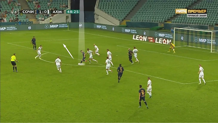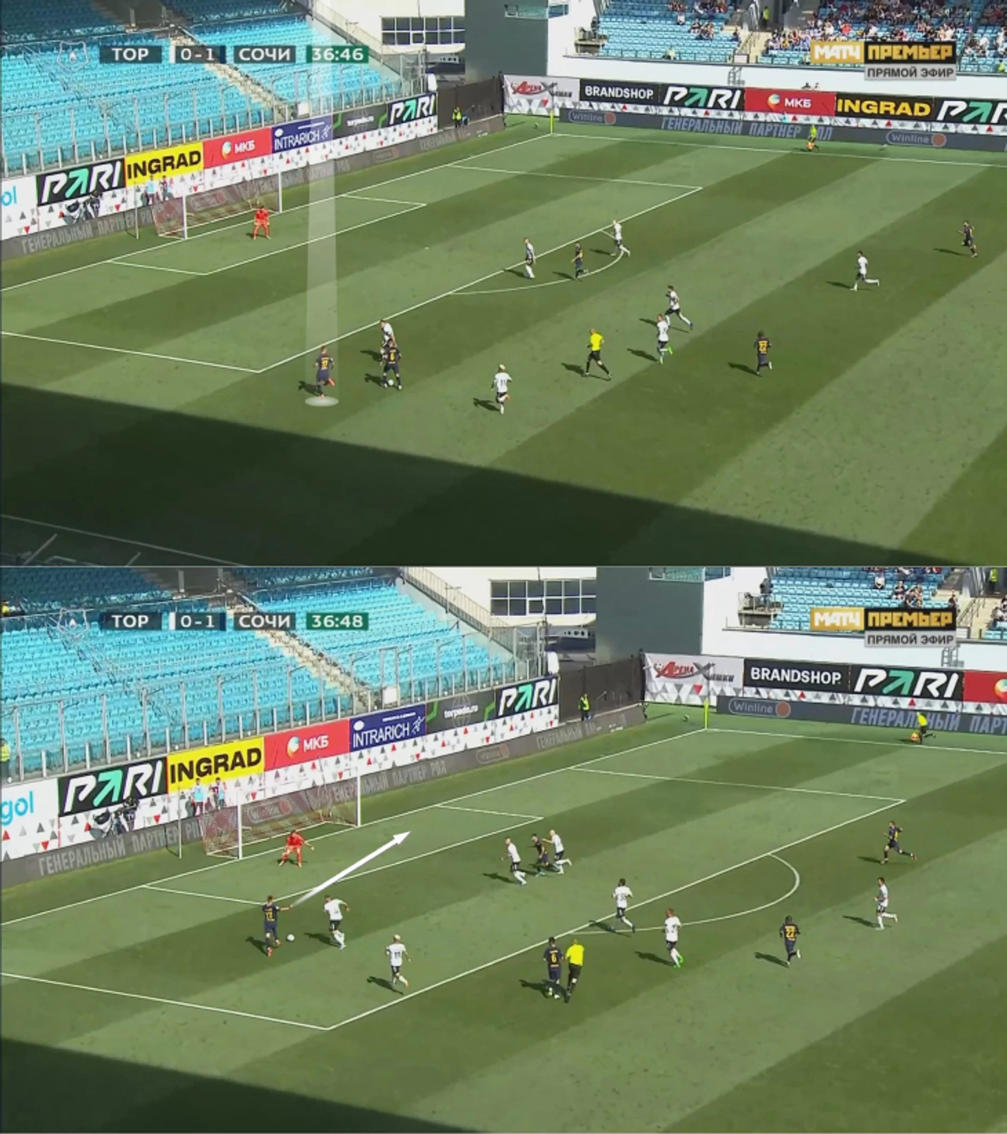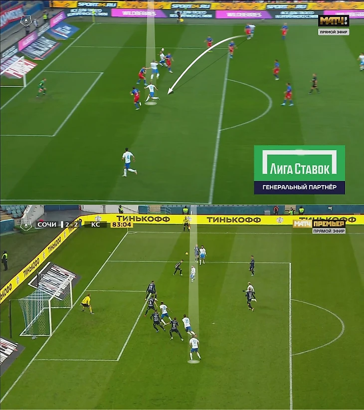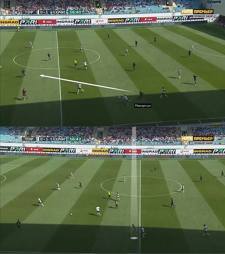 С «Ахматом» (2:1) помогло исполнение Нобоа, но интересна зона голевой передачи: после аута Макарчук забежал в штрафную, а Крис заполнил его зону. Подобное Макарчук и Маргасов исполняли против «Динамо» (2:1) и «Химок» (4:1): врывались в штрафную, подыгрывали и реагировали на навесы.