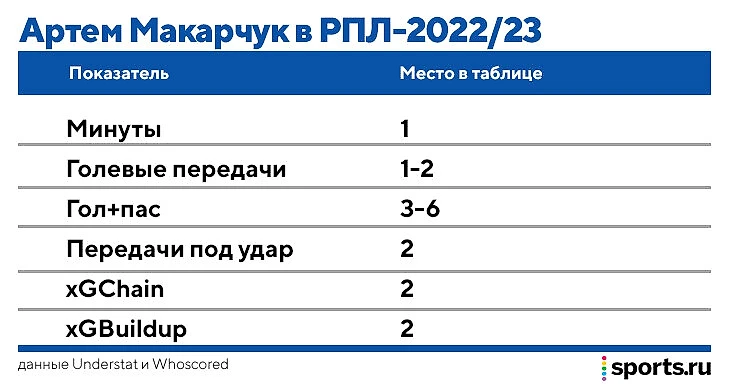 Внутри своей роли Макарчук обладал большой свободой: атаковал вместе с Юсуповым, Нобоа и Тереховым (стеночки, поиск свободных зон), высоко подключался и тоже заполнял штрафную. Благодаря такой активности Макарчук в топ-3 «Сочи» по передачам под удар, прямому (xGChain) и косвенному (xGBuildup) вкладам в создание опасных моментов.